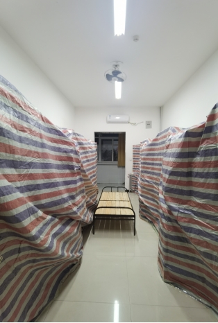 封存工作于晚上19时30分开始,公司领导及9名教师志愿者分工明确,配合紧密,男老师在宿舍外丈量切割尼龙布,女老师用尼龙布、胶带、塑料绳等物品把床铺从上到下整体进行细致地封闭,只留出两列床铺中间的位置,摆放行军床。大家忙碌而有序,整个封存工作持续了两个半小时。