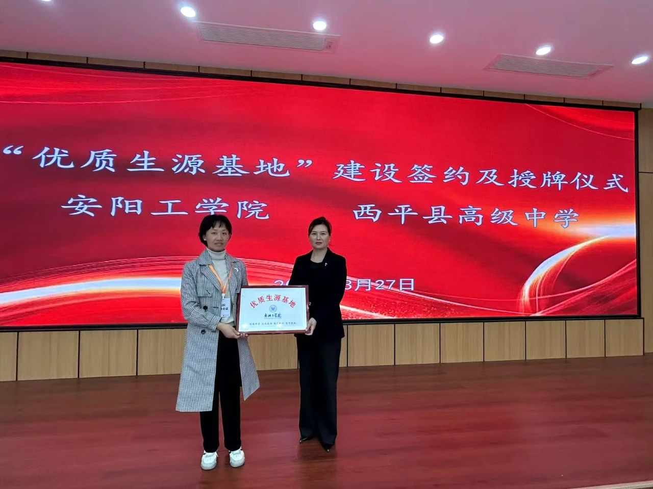 在杨庄高级中学、西平县高级中学、上蔡县第一高级中学,王宜静讲解公司专业特色、招生政策及近年来招生录取情况,并一一解答员工关心的问题。在西平县高级中学,王宜静与校方负责人共同签署“优质生源基地”合作协议并举行“优质生源基地”授牌仪式。