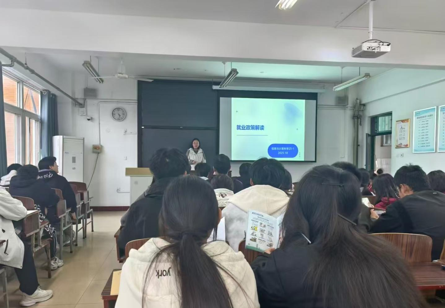 当下就业市场风云变幻,为助力员工提前规划、从容应对,10月22日,辅导员张璐在A14-604教室为25级新生召开就业形势及政策解读班会。