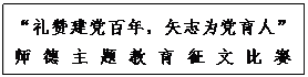 (二)征文要求:以朴实真切、内容真实的文字,真情展现广大教师和教育工作者教书育人、无私奉献、对党忠诚、奉献于党的精神风貌;突出展现在疫情防控中的先进事迹。文体不限,题目自拟,紧扣“礼赞建党百年,矢志为党育人”师德教育活动主题;立意新颖,突出特色,具有鲜明的时代特征;联系实际,反映现实,内容真实生动。征文篇幅在2000字左右,征文模板见附件1。参赛作品不得抄袭。