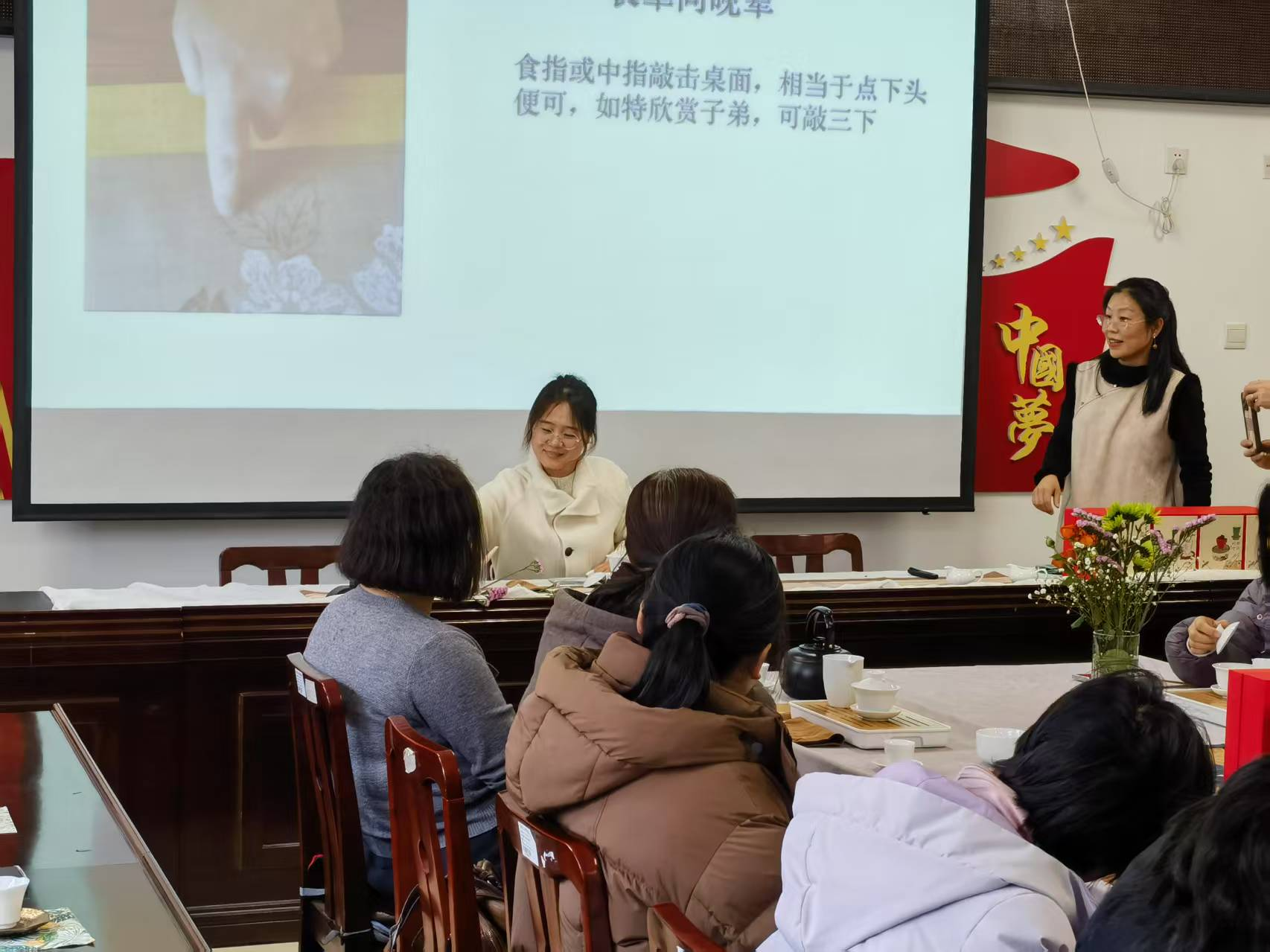 体验活动中,茶艺师从茶叶的分类、鉴别方法讲起,深入介绍了泡茶的器具、水温、手法以及不同茶品的冲泡技巧,让大家对博大精深的茶文化有了更为全面的认识。在实操环节,大家纷纷动手,亲自体验泡茶的乐趣。温杯、投茶、注水、出汤……在茶艺师的耐心指导下,女教职工们一招一式有模有样,专注的神情、优雅的动作,构成了活动现场一道道美丽的风景线。茶香袅袅升腾,大家一边品味着亲手泡制的香茗,一边分享着工作与生活中的点滴感悟,欢声笑语回荡在整个活动现场。