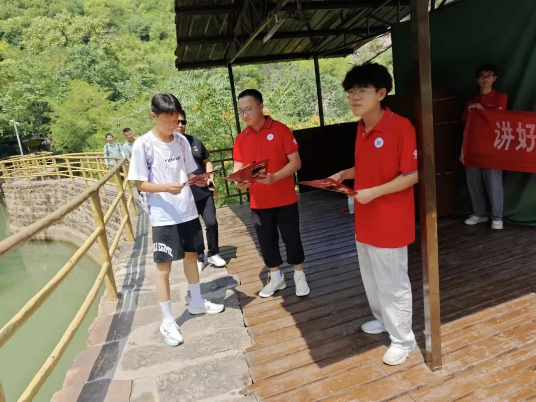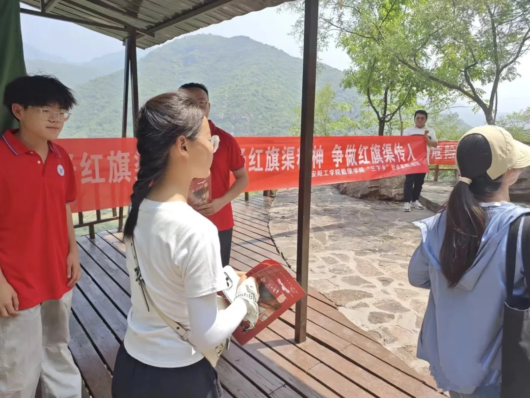 7月4日,实践团队员们来到青年洞景区,亲身感受红旗渠修建的艰辛不易。崎岖的山路,狭窄的通道,每一处都向队员们诉说着建渠之难、修渠之苦。走访的过程中,队员们抓住每个机会,向来往的游客们以及研学的员工群体发放宣传册,并就各自对红旗渠精神的理解进行分享和交流。